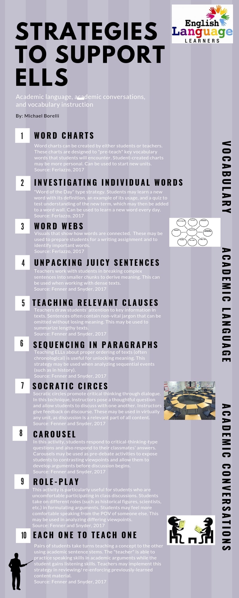 Here is an info-graphic that I developed to summarize ten common strategies that are used to help ELLs across all contents. Although this is not an exhaustive list of best practices to support language in a diverse classroom, these are strategies that I feel I can readily implement into my classroom in the future. This depiction may be a valuable source to not only teachers and school leaders, but also parents of ELLs. This shows parents some of the techniques that teachers are using to help their child learn English in conjunction with content material. It can easily be adapted to other languages so it can be understood by a greater audience.